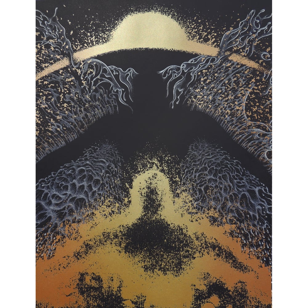 420 posters were printed, I have 50, and all of mine are metallic edition (on tour, those were the posters numbered after 170), with a gold to copper vertical gradient. The image here is actual photo of the print.