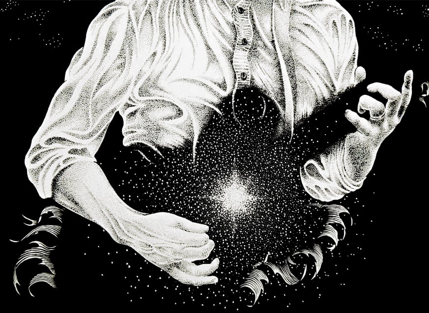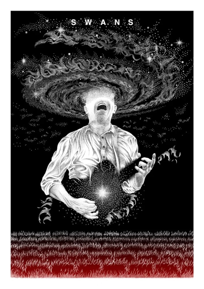 In keeping with Swans' use of sound as means of achieving transcendence, the figure of Michael Gira strums the guitar chord which releases fiery tidal waves of sound (6 rows of waves/guitar strings), the volume of which obliterates the musician/listener, the mind dissolving into a cosmic consciousness. It was also inspired by the architecture of the Schauspiel theater where the original concert took place, the waves being also the rows of red seats, the galaxy spiral mirroring the shape of the vast spiral chandelier.
